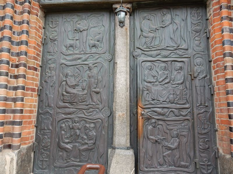 Helaas was het de volgende dag (Koningsdag) bij ons niet droog dus moesten verplicht rust houden in de camper en blijven gewoon wat langer hier. De dag erop was het wel droog maar heeeeel koud en erg veel wind. Hebben een paar uur in het centrum van Kolobrzeg doorgebracht maar viel tegen. Centrum is in WOII verwoest geweest maar gelukkig niet opgebouwd met betonnen blokkendozen. Kathedraal is ook verwoest geweest en weer opgebouwd. was van binnen een beetje koel, wel was de deur mooi.