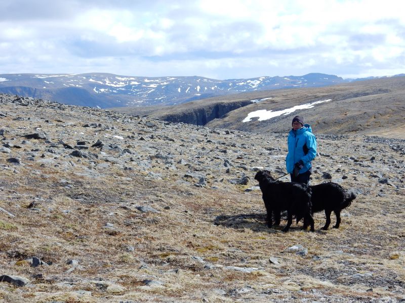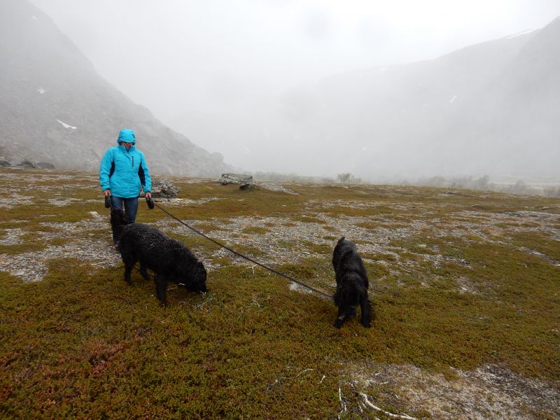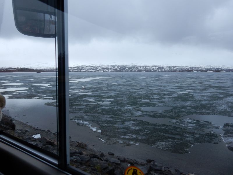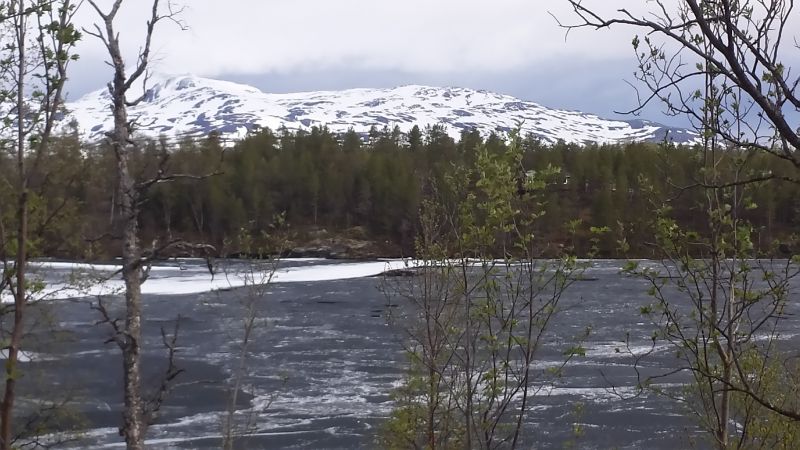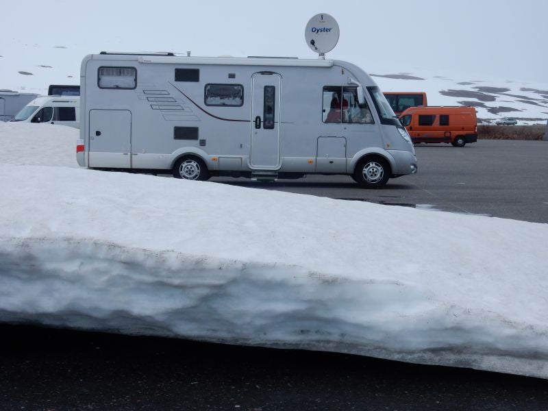 Dinsdag morgen zijn we na een winderige en koude (0 gr) nacht al vroeg naar Mo I Rana gegaan. Hebben redelijk veel regen onderweg gehad. In Rana wilden we de laatste diesel en LPG in Noorwegen halen en we wilden graag wind en regen dichte broeken kopen die je hier veel ziet. Ook weer geleegd en gevuld. Dus waren we klaar voor Zweden. We hadden weer een mooie tocht over een hoogvlakte met veel sneeuw en zelfs meren die nog half bevroren waren op 500 tot 600 meter. Onderweg hebben we weinig plekken gezien waar we konden overnachten, maar om 16:00 vonden we een plek op een parkeerplaats van een gewezen camping op 480 meter hoogte. Was een verlopen troep, maar goed genoeg voor ons, kunnen met honden goed uit de voeten en hebben een mooi zicht op een besneeuwde berg. Morgen nog 1x een tussen stop voordat we de Oostzee zien.