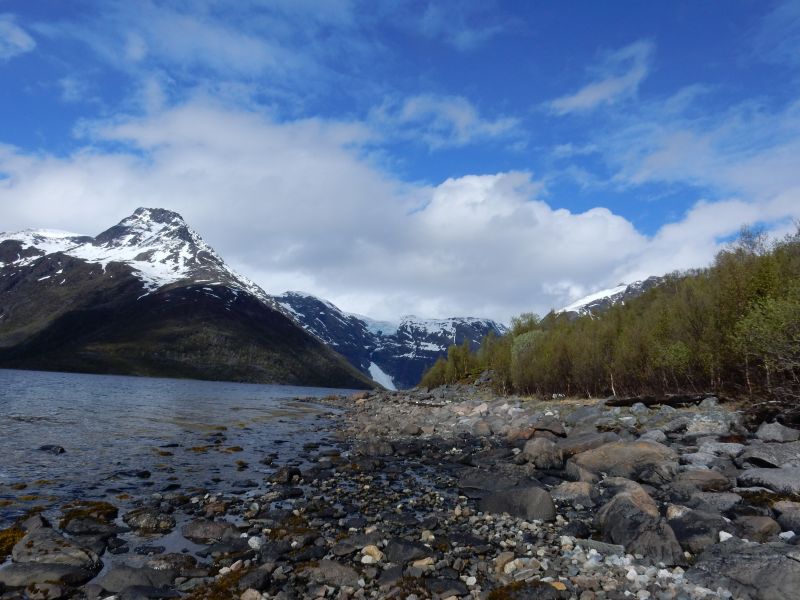 Zaterdag morgen 6 juni eerst wat boodschappen gedaan in Alta en wat gebak voor de zaterdagavond (goede gewoonte) gekocht. Het weer was mooi met volop zon en een strak blauwe lucht en was dan ook een mooie tocht langs de Altafjord, was echt genieten. Omdat we redelijk vroeg op de geplande CP in Talvik waren hebben we alleen daar de gebruikelijke SANI dingen gedaan en gegeten maar ook wat vogels zitten spotten, daarna zijn we naar een afgelegen CP (doodlopende weg) bij een gletsjer aan de Oksfjord in de buurt van Saltnes. Je kon naar de gletsjer lopen en was “maar” 8 km. Wij hebben het pad ook gelopen voor ca 1 km. Maar wil je er helemaal heen is het echt een dag tocht vanwege de conditie van het pad en de vele obstakels zoals stroompjes, rotsblokken etc. Maar het uitzicht was geweldig. Terug heeft Ger even een brood en toch maar ook een cake gebakken. In de avond om 22:00 zoals gewoonlijk de afgelopen weken de horren op verduisteren om het donker gevoel te krijgen voor we naar bed gaan. Het wordt weer een heerlijke rustige nacht, geen mede campers en autos die langs komen.