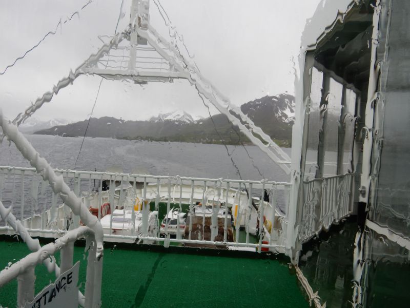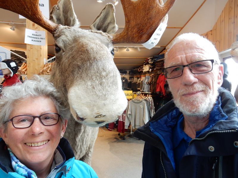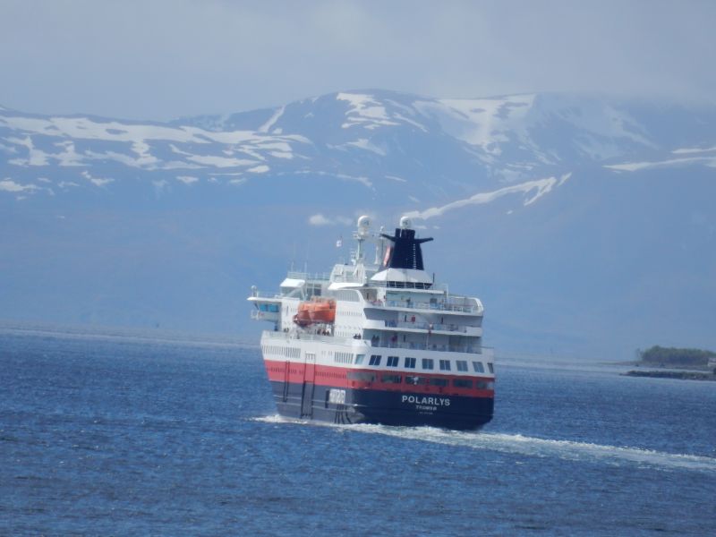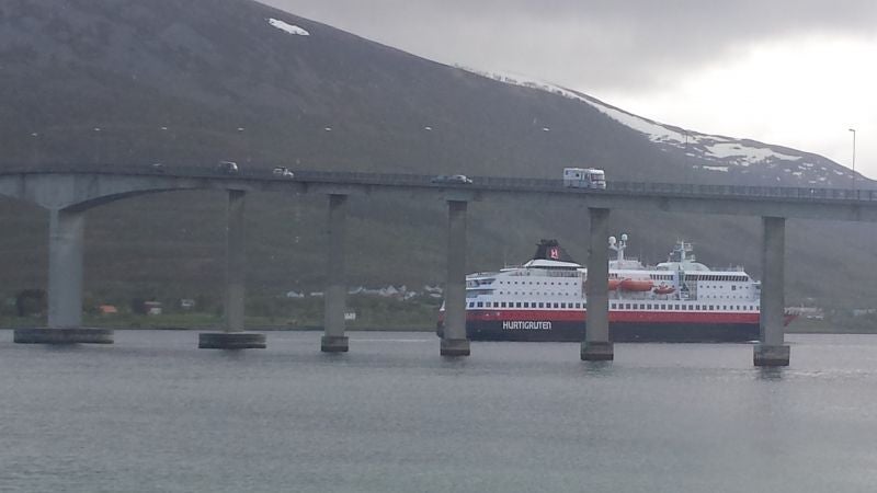 Toen we opstonden konden we zien dat de vele regen van vannacht poedersneeuw op de bergtoppen had veroorzaakt. Na de krant downloaden, brood en gebak voor morgenavond in het winkel centrum aan de overkant gehaald te hebben reden we via 2 benzinestations, 1e voor vullen en tweede voor legen om 10 uur weg. Onderweg zijn we naar een doorgang tussen 2 fjorden, de Raftsunder, gereden. Het is hier erg smal en de Hurtigrut kan er maar net doorheen.