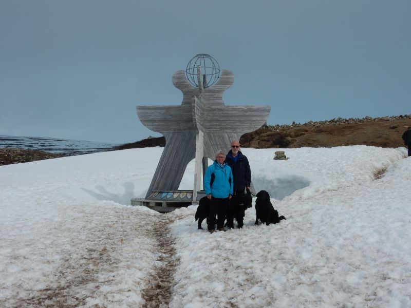 Maandag 15-6 eerst brood halen tegenover de CP en even aftanken want diesel is “goedkoop” hier. Is hier 20 eurocent p/l goedkoper dan mij laatste tankbeurt. Via de vele tunnels doen we de laatste fjorden tot aan Fauske. Daarna gaan we meer het binnenland in nog steeds via de E6. We komen nu meer in de bergen en uiteindelijk op een hoogvlakte met volop sneeuw en komen aan op de CP die op de poolcircel ligt. Alweer maar nu zonder Kerstman. Ondanks de sneeuw is het in de middag toch 10 graden. Aan het einde van de middag werd het weer kouder en hadden we zelfs hagel en sneeuwde het wat.
