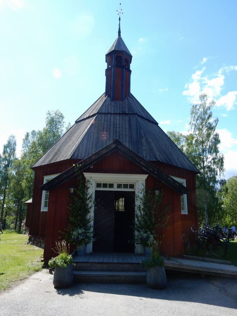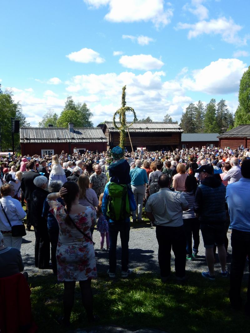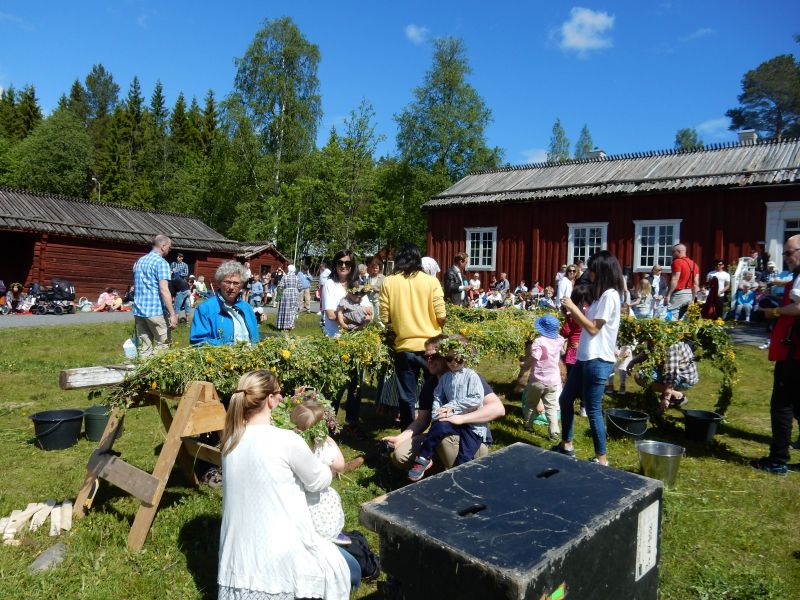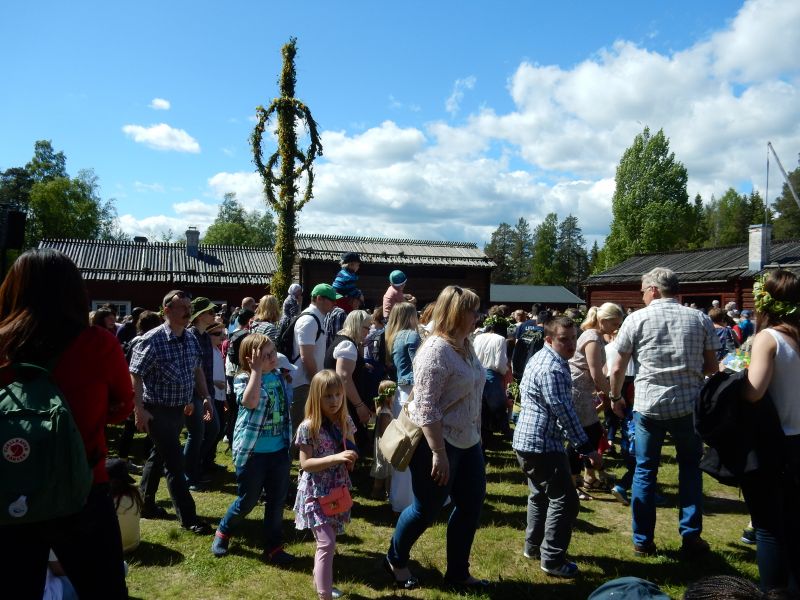 Op vrijdag 19-6 hebben we gezorgd om voor de start van het feest om 12:00 op het feestterrein te zijn wat is bij het openlucht museum. Ca 20 min op de fiets. Het was er gezellig druk en iedereen zat te picknicken op het terrein. Er waren etens kramen met eten uit allerlei landen. Er zijn hier veel vluchtelingen woonachtig die in onze ogen volledig geïntrigeerd en geaccepteerd zijn. Men had, de vrouwen en meisjes, bloemen kransen in hun haar. De “mei-boom” werd ook bekleed door iedereen en om 13:00 werd hij omhoog gezet. Daarna ging men erom heen dansen en werd er gezongen. Eén liedje kennen wij ook, maar konden de woorden niet vinden :). Wat wel opvallend is, is dat er geen drank te koop is, alleen koffie of limo. Na afloop hebben we nog even het museum bekeken, alleen was het jammer dat het meeste niet met Engelse teksten was. Daarna zijn we nog even naar het centrum gegaan, het was daar echt een spookstad, zo stil. Er was niets open, geen pub zelfs geen restaurant, alleen een ijstent. We hebben, onder genot van een ijsje in de zon, de krant gedownload en ik heb getracht de website te doen wat niet lukte. Terug op de CP hebben we ff lekker buiten gezeten en zelfs gegeten in de zon. Goh dat was lang geleden.